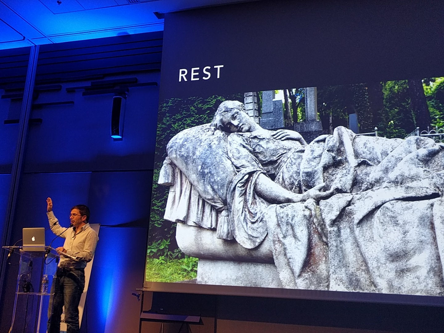 Pour revenir à la conf’, le style est mordant, empli d’un humour pince sans rire, tout le monde se reconnaît dans les allusions, et les visuels entre les slides techniques détendent les zygomatiques pour faire passer la pillule de notre devoir de changer nos habitudes.
