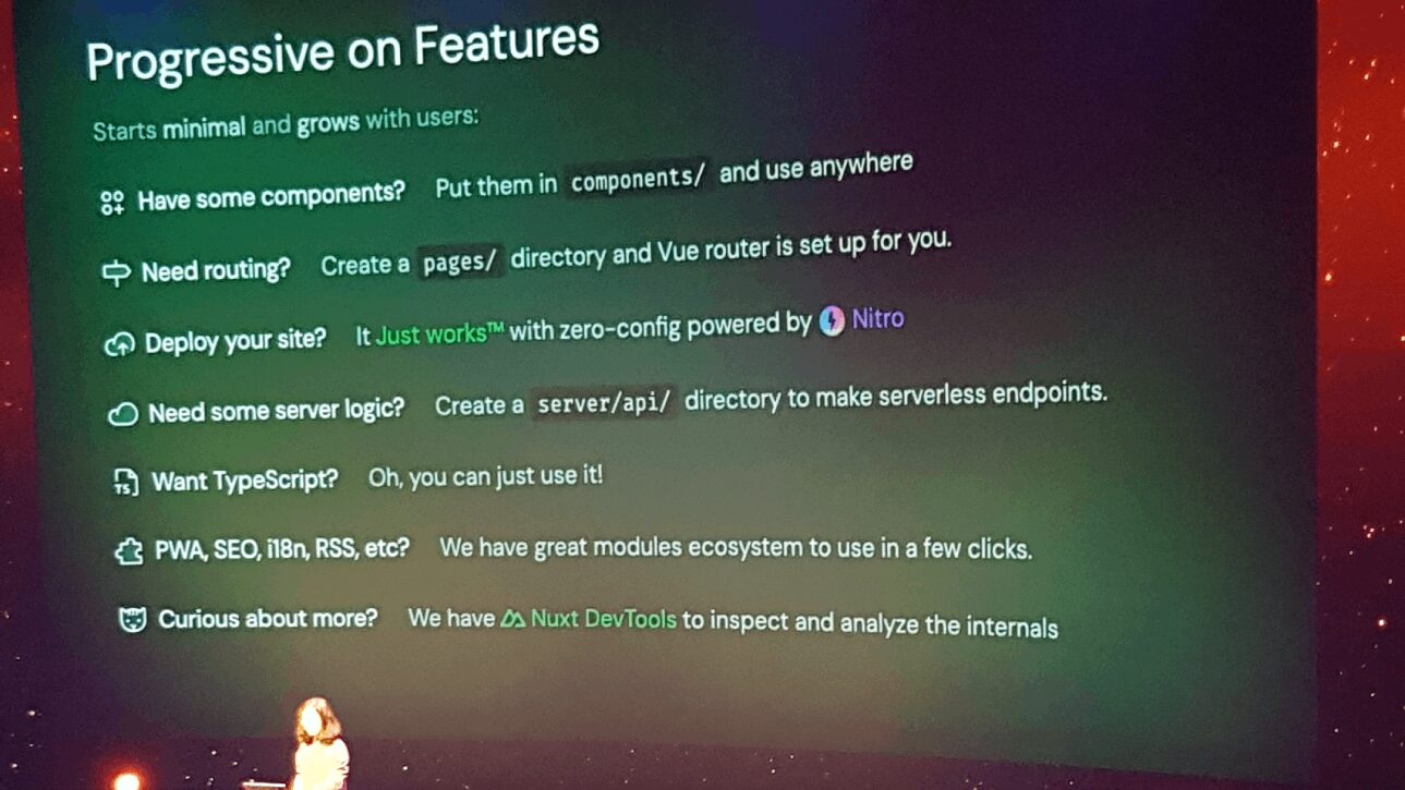 En effet, avec Nuxt on peut commencer petit, et ajouter des fonctionnalités au fur et à mesure.\ Besoin de composants ? De pages ? Il suffit d’ajouter les dossiers correspondant et tout fonctionnera automatiquement.\ Besoin de plus qu’une SPA ? Il suffit d’ajouter un dossier server, une route et hop ! L’application est devenue full-stack.\ Et c’est la même chose pour Typescript, les devtools, et les nombreux modules compatibles avec le framework.\ Même le déploiement a été pris en compte grâce aux preset de Nitro, le serveur utilisé par Nuxt.