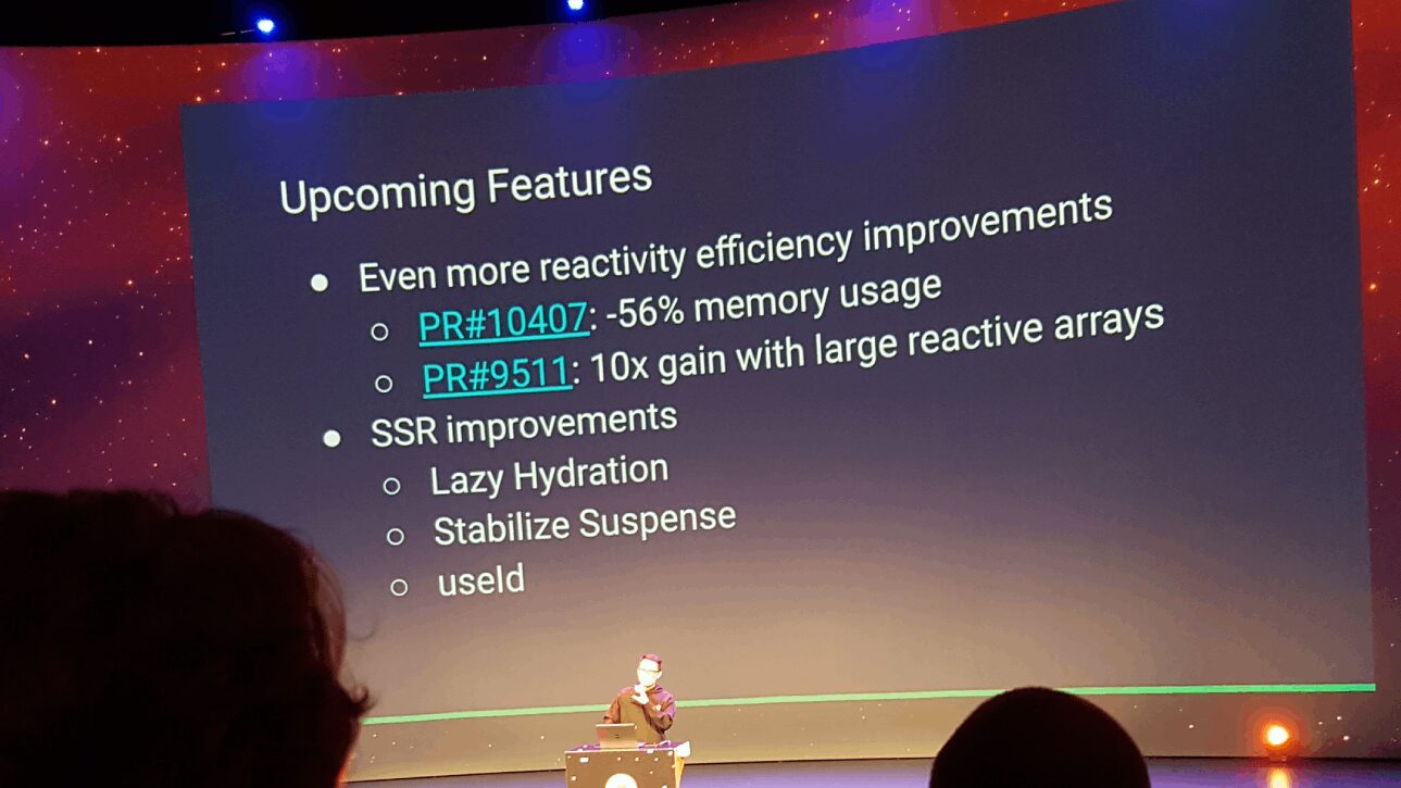 Il a rappelé que Vue est le seul framework front-end vraiment indépendant, n’étant rattaché à aucune entreprise, et que ça laisse à la core team toute latitude pour répondre aux besoins des utilisateurs.