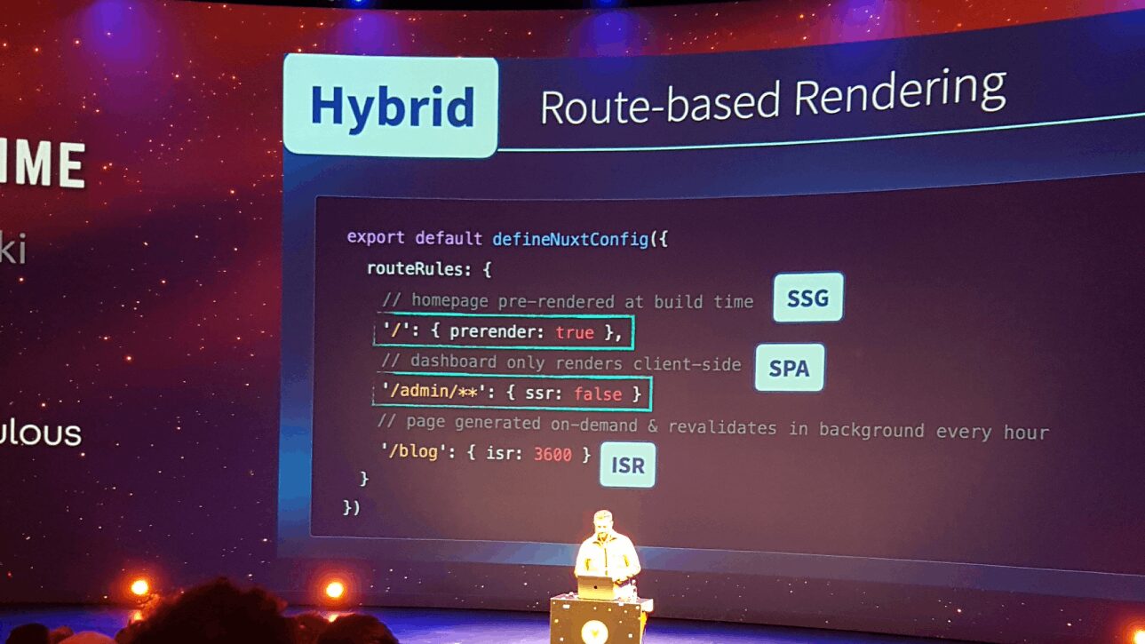 Enfin, Nuxt propose un mode de rendu hybride, basé sur l’url qui permet de rendre des pages selon des modes de rendu différents. On peut donc imaginer une page d’accueil dynamique, rendue en mode serveur, et une page à propos, moins sujette aux changements, rendue en mode statique.