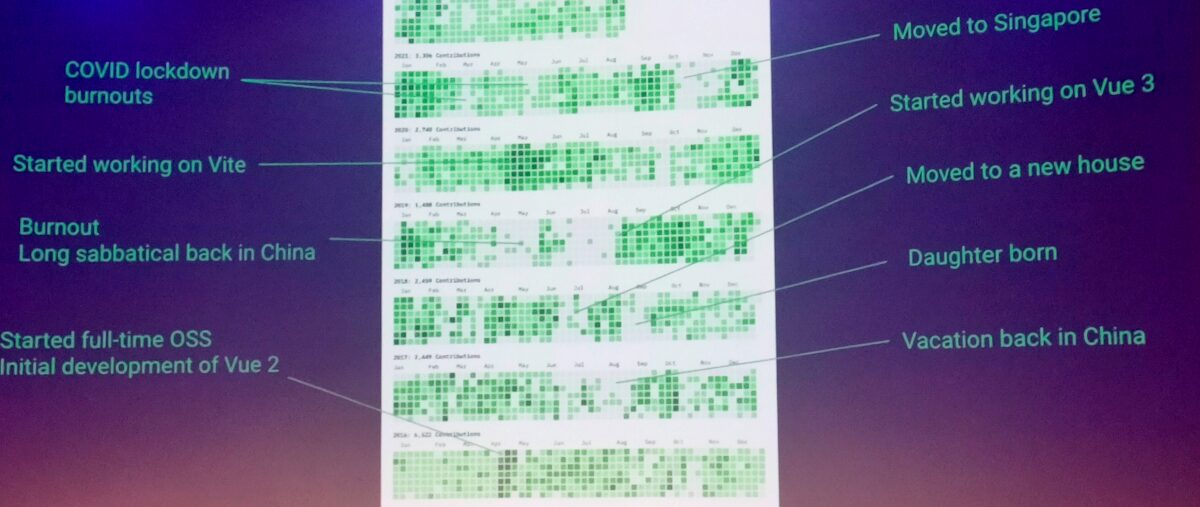 Un autre point intéressant de la conférence : Evan revient sur les burnouts qu’il a connu au fil de ces 10 années à travailler sur Vue et son écosystème.