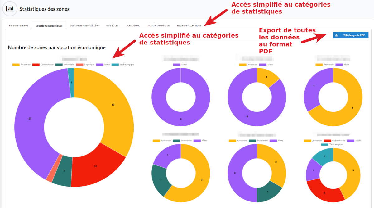 Dans une optique de permettre une analyse rapide, y compris pour des interlocuteurs non technicien, le tableau de bord intègre 2 dimensions importantes : la présentation sous forme de diagramme des données principales, et la possibilité d’exporter les statistiques et leur représentation visuelle au format PDF.